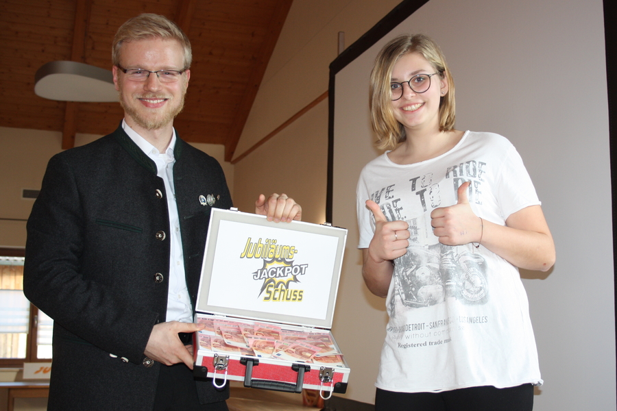 Am Ende der Veranstaltung wurde der Jubiäums-Jackpot-Schuss an einen Jugendlichen vergeben. Insgesamt 150,50 Euro waren im Pott und mit einem ausgelosten 985,3 Teiler konnte sich Angelina Wolf von Hubertia Altenerding darüber freuen. Sie gewann im zweiten Anlauf, da der Gewinner den Preis nur erhält wenn er anwesend ist und der erste ermittelte Gewinner nicht da war. Die Freude der Siegerin war riesig als Gaujugendleiter Felix Zacherl den Preis überreichte.