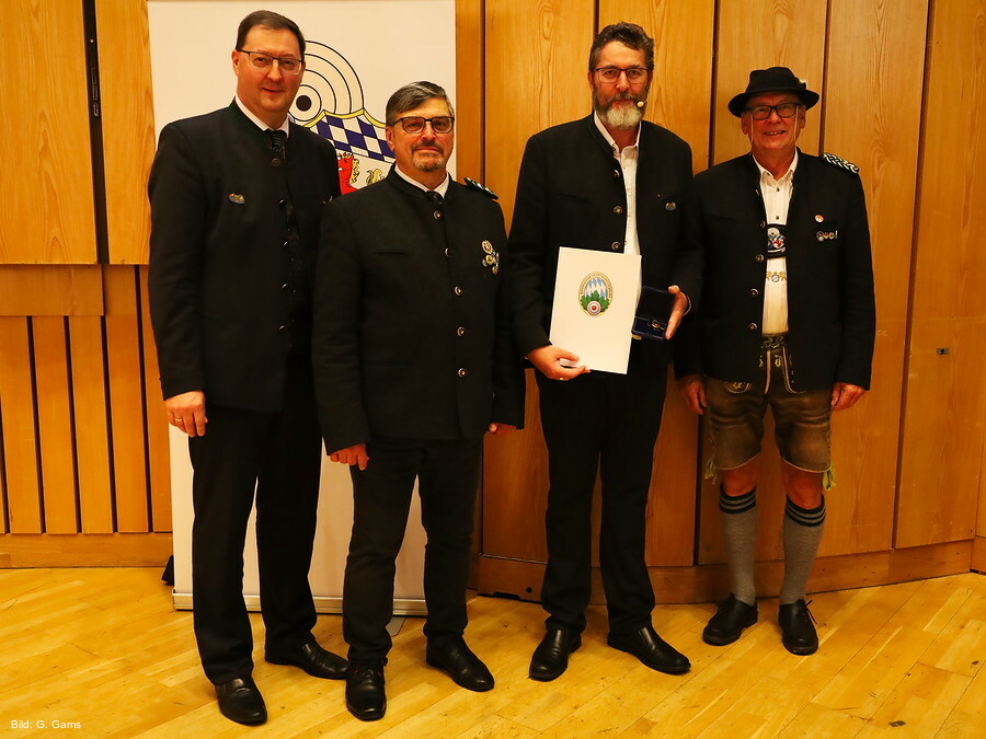 Für seine langjährige Arbeit im Schützenwesen wurde Gauschützenmeister Klaus Waldherr von Landesschützenmeister Christian Kühn mit dem Ehrenkreuz in Bronze des Deuteschen Schützenbundes ausgezeichnet. Er arbeitet nicht nur auf Gauebene für die Schützen sondern ist als Bezirksjugendleiter seit vielen Jahren auch überregional tätig.