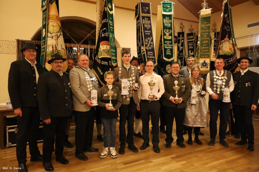 Die Jugendwertung mit dem Bogen gewann mit einem 147,5 Teiler Simon Steinleitner von Edelweiß Tading, der leider nicht anwesend war. Josef Grassl, ebenfalls von Edelweiß Tading kam mit einem 162,5 Teiler auf Platz zwei vor Alexandra Fink von Alt Niederneuching mit einem 180,0 Teiler.